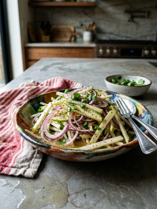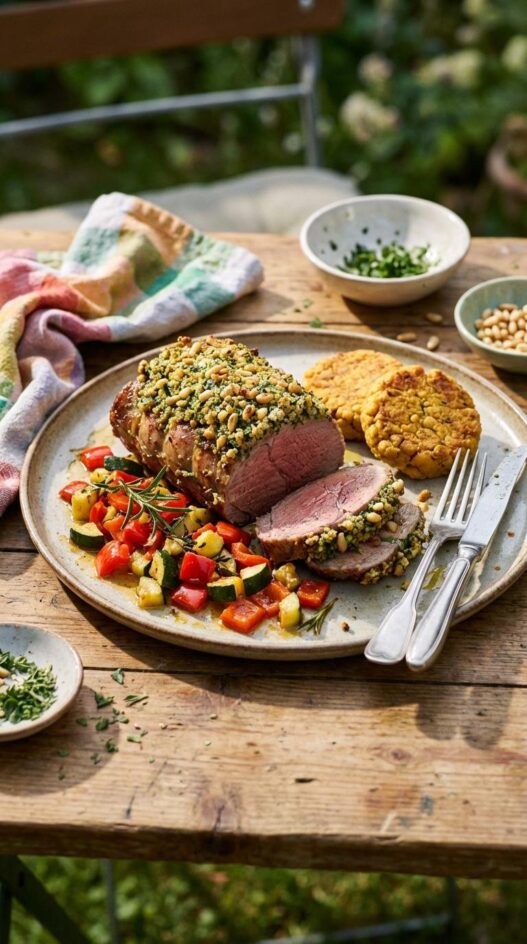 This is a thick herb crust built on pine nuts and parmesan, pressed onto seared lamb and roasted until the outside turns golden and the inside stays pink. The crust holds. It doesn’t crumble off when you slice. I brought this recipe home to Australia and have made it a dozen times since, adjusting almost nothing.