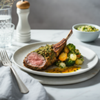 A flavorful herb-crusted saddle of lamb, complemented by a vibrant paprika-zucchini medley and savory chickpea patties. Perfect for a special occasion.