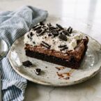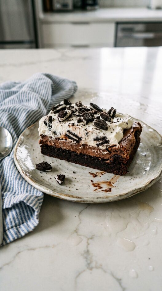 Three layers, one 9×13 pan, and about an hour start to finish. The base is a chocolate cake mix pressed flat like a brownie. The middle is a cream cheese layer with powdered sugar and vanilla, loaded with chopped Oreos. The top is whipped cream with cocoa. Each layer is different in texture and they stack up into something worth cutting into squares and putting on a plate. Bring these to a gathering and they will go fast.