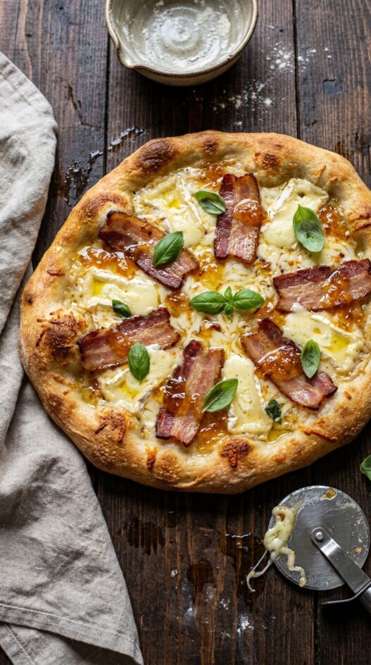 A gourmet pizza experience. Creamy brie, salty bacon, and a touch of sweet marmalade, all elevated with truffle oil.