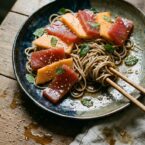 Citrusy ponzu sauce and sesame seeds lay over thinly slices ahi and melon sashimi. A fresh, light meal made complete with buckwheat soba noodles.