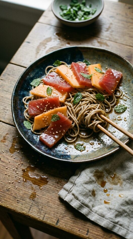 Tuna and Cantaloupe Sashimi over Ponzu Soba Noodles