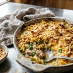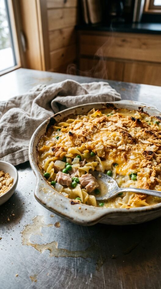 Tuna noodle casserole is the dish that fed postwar America and never really went away, because it works. Egg noodles, canned tuna, peas, and a from-scratch cream sauce baked under a buttery cracker topping. It is unpretentious, deeply satisfying, and costs almost nothing to make — the kind of meal that reminds you home cooking does not need to be fancy to be good.