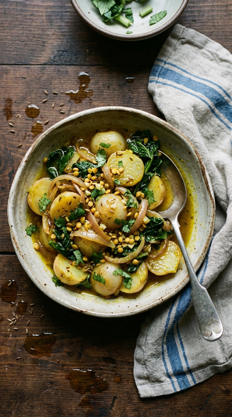 Turnips got a fair amount of airtime in the kitchen I grew up around, mostly because they were cheap and kept well through winter. My mother used them in soups mostly, nothing exciting. It took a recipe from a friend’s grandmother, a North Indian version with cumin, caramelized red onion, and toasted moong lentils, to make me understand what turnips were actually capable of. The greens go in at the end and cook down quickly. Nothing is wasted. This is a dish that improves the second day, when everything has had time to settle.