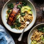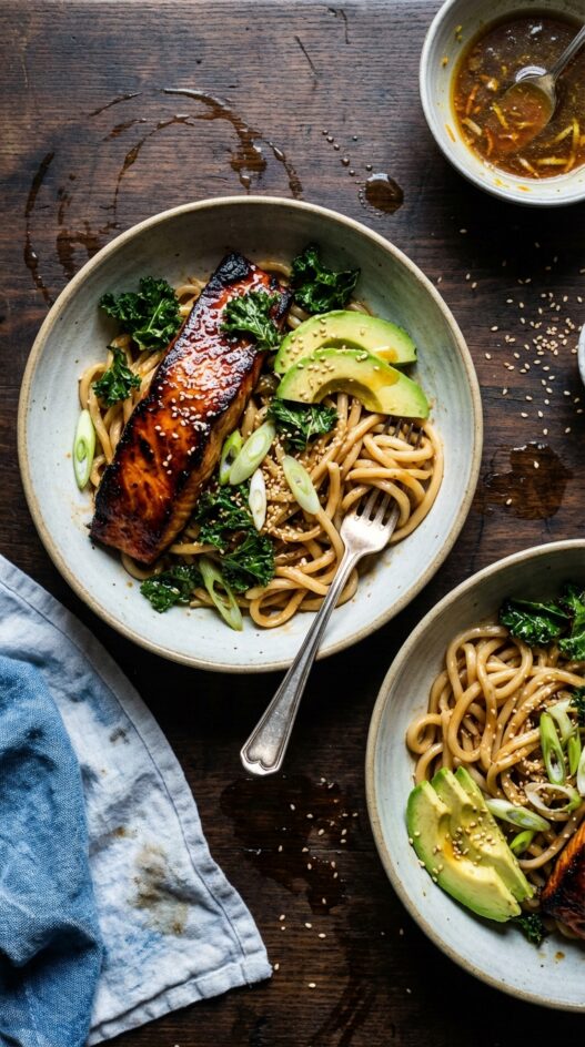 Udon noodles tossed in a citrus-soy dressing, topped with miso-honey glazed salmon, crispy kale, and avocado. A flavorful and satisfying weeknight meal.