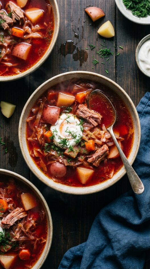 - Serve hot or cold with shredded sparerib (optional). Garnish with dill and sour cream.