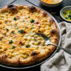 - Spoon the mac and cheese onto the crust and top with additional shredded cheddar cheese.