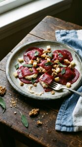 Let the dark, bitter, earthy notes of the dark chocolate ganache and cocoa nibs contrast to a deep, sweet Port or Vin Santo wine.