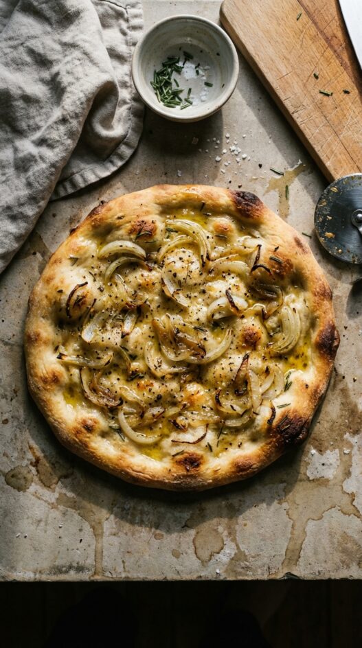 Inspired by an Umbrian bread, this on onion pizza is soft with crisp edges and thin sweet onions on top.