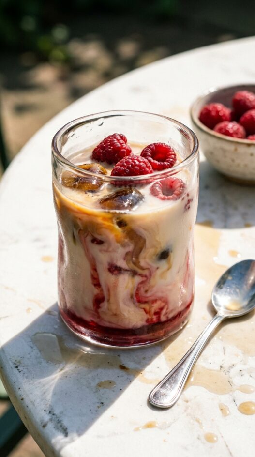 A refreshing spring drink for coffee lovers, combining the rich flavors of vanilla and raspberry with a cool coffee kick.