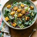 Hearty vegan kale Caesar salad gets a satisfying crunch from crispy polenta croutons. A simple, flavorful weeknight meal.