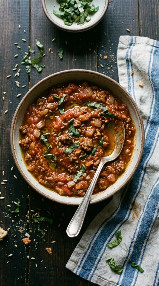 Hearty and flavorful, this vegan bolognese uses San Marzano tomatoes and Beyond Meat for a satisfying plant-based twist on a classic.
