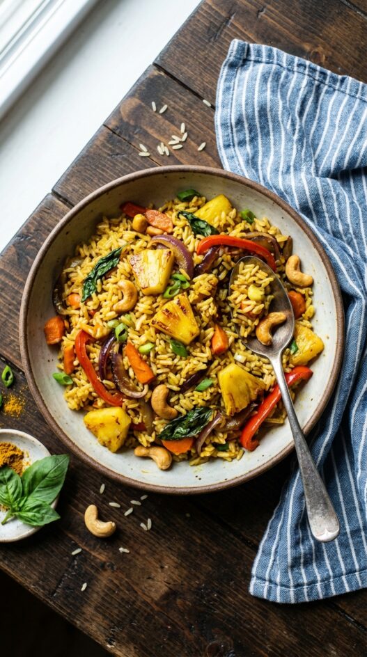 Sweet and savory fried rice, perfect for a quick weeknight meal. A vibrant mix of pineapple, veggies, and warming spices.