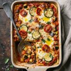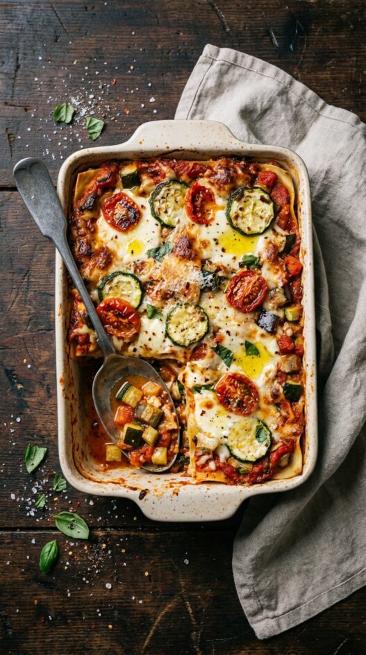 Vegetable lasagne has a bad reputation for being watery and bland, and that reputation is earned when people don’t take the time to cook the vegetables down first. The zucchini and eggplant in this version need to sauté long enough to give up their moisture before they go into the baking dish. Ricotta, mozzarella, and Parmesan layered generously with fresh tomato puree turns it into something genuinely satisfying. Basil goes in both the sauce layer and on top after baking. A full hour in the oven gives the edges time to caramelize, which is where all the best bites come from.