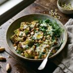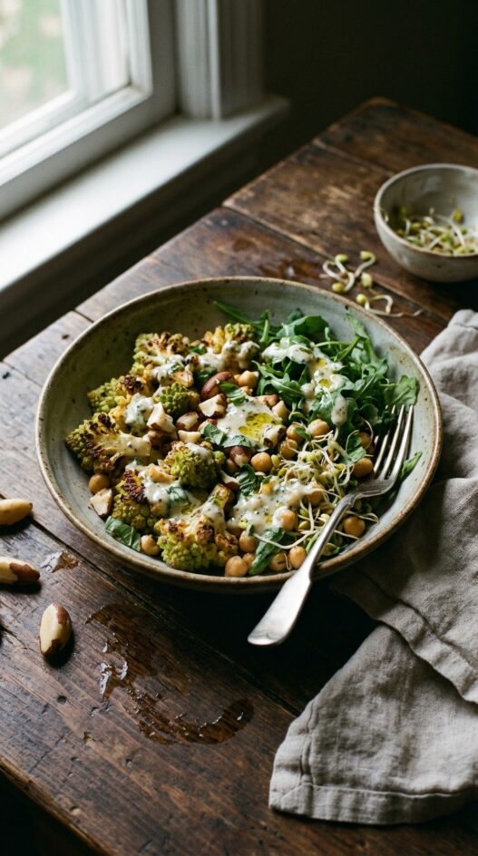Crispy roasted cauliflower and chickpeas tossed with vibrant greens, crunchy nuts, and a creamy dressing. A healthy and satisfying vegetarian meal.