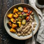 Making these Roasted Vegetable Quinoa Bowls is so easy, it just requires a little prep work. I chose to use golden beets, Brussels sprouts, rainbow carrots, red onion and acorn squash. Any root vegetables would be great in these bowls, I just used what I had on hand. I put the vegetables on two sheet pans and separated them by how long they would take to roast. While the vegetables were roasting it was the perfect amount of time to cook the quinoa and make the maple balsamic dressing. The maple balsamic dressing is optional, but it adds nice flavor to these healthy bowls. This is a great dinner to make if you’re gluten free, vegan or a roasted vegetable addict like myself who just can’t get enough of them!