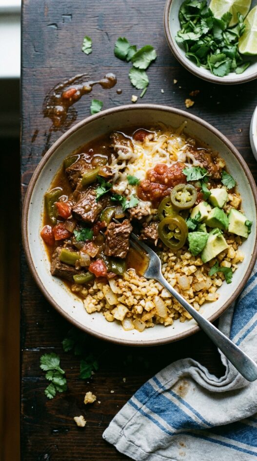 Hearty beef stew meets vibrant cauliflower rice in this satisfying bowl. Perfect for a weeknight dinner or a casual get-together.