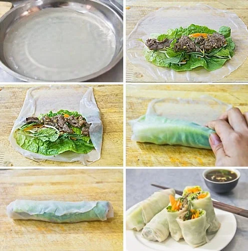 Whether it’s dining with family or having friends over, rice paper roll DIY makes a fun social activity at the dining table. Place salad, beef, rice paper, and dipping sauce on the table. Prepare a few deep plates or large bowl deep enough to drip the rice paper in, filled them with hot water. Invite guests to dip the edge of the rice paper in the water and turn to wet evenly. Place the salad and beef and roll up like a spring roll.