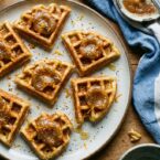 - Place a 1/2 teaspoon of apple butter into one square of each waffle.
