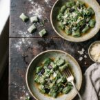 I adore the fresh, green color of the gnocchi I’ve made, and keeping it simple by tossing it in browned butter, black garlic and parmesan, the flavors aren’t over-complicated. The sweet, smokiness the black garlic brings is magical – love the stuff.