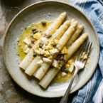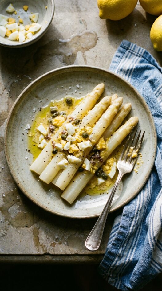 Tender white asparagus spears tossed in a vibrant lemon-anchovy sauce. A sophisticated yet simple side dish.