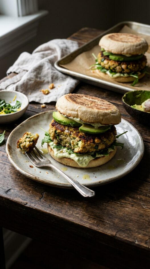 Flavorful veggie burgers with a vibrant green olive-basil aioli. Perfect for a light and satisfying weeknight meal.