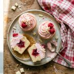 Divine vanilla cupcakes with white chocolate chips, filled with raspberry puree and topped with a white chocolate buttercream frosting.