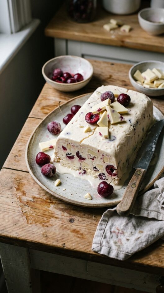 A dreamy white chocolate dessert, brightened with tart cherries. No-churn, easy to make ahead!