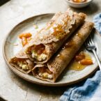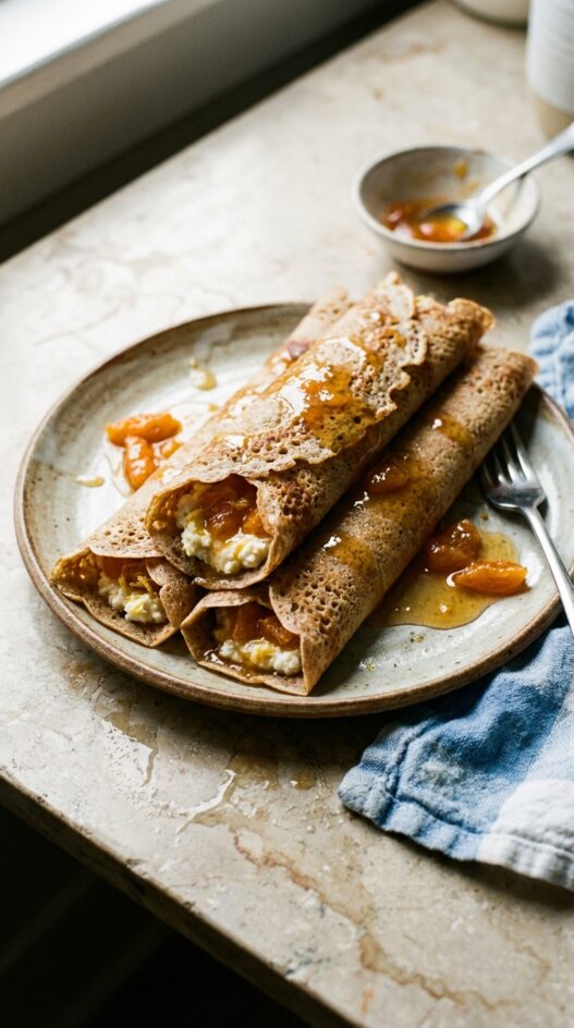 Hearty whole wheat crepes filled with sweet apricot preserves and creamy ricotta.