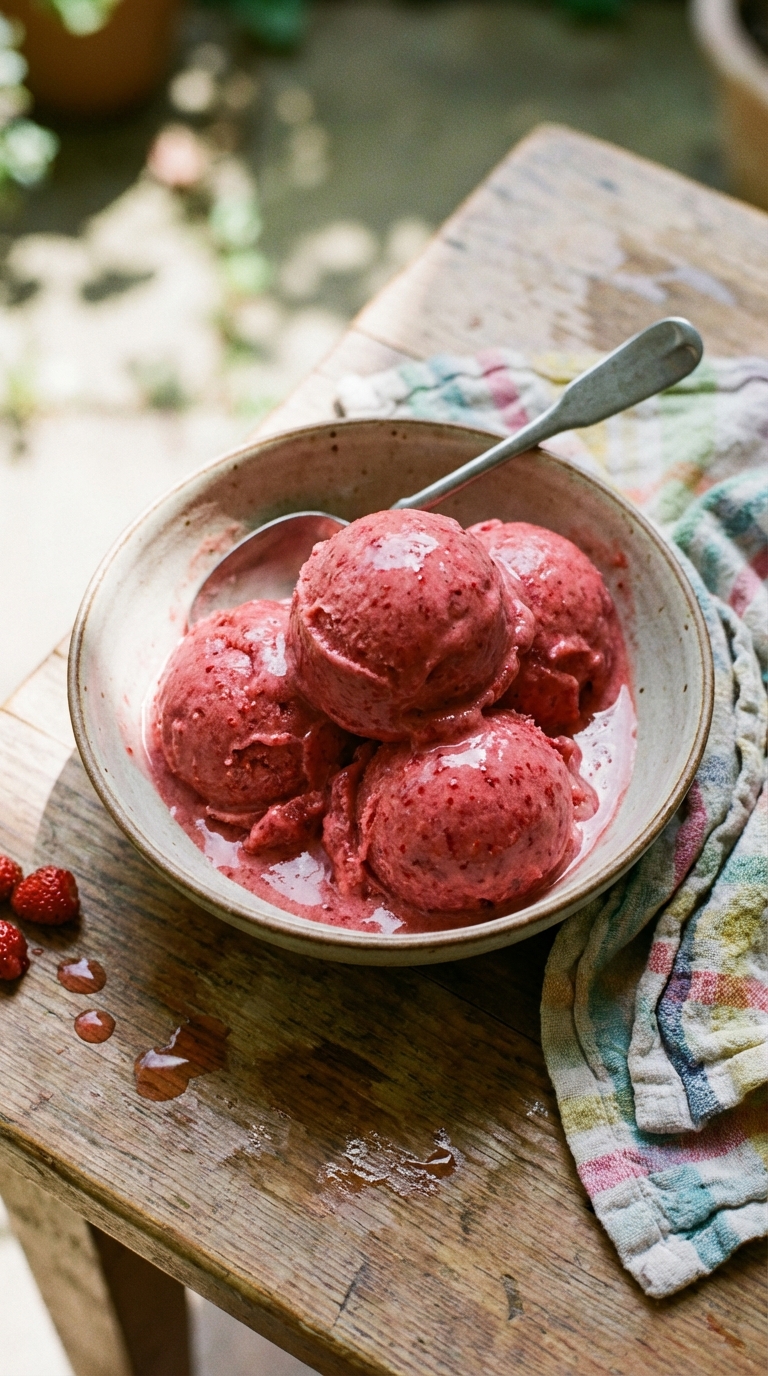Wild strawberries are smaller, more tart, and more fragrant than the cultivated kind. No shortcuts. If you can get them, use them. If you can’t, standard strawberries work but the ice cream will be sweeter and less interesting. The gin in this recipe isn’t there to add flavor; alcohol lowers the freezing point and keeps the texture scoopable rather than icy. Vodka works exactly the same way if gin isn’t your thing. Macerate the fruit for a full hour, not thirty minutes. That hour softens the berries and pulls the sugar into the juice, which blends smoother in the cream.