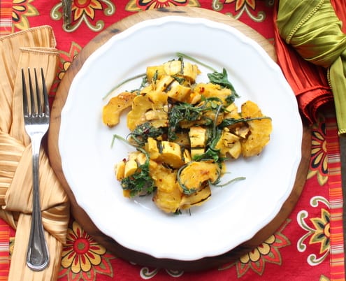 Delicata squash skin is edible, adding texture and color to the dish. Adjust the red pepper flakes to your spice preference. This dish can be made in advance and reheated. Leftover squash can be stored in the refrigerator and used the next day.