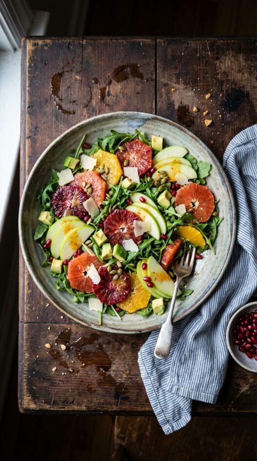This winter salad features a variety of citrus fruits, as well as apples, pomegranates, and avocado. Yep, avocado is technically considered a fruit. Who knew?!