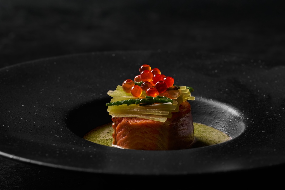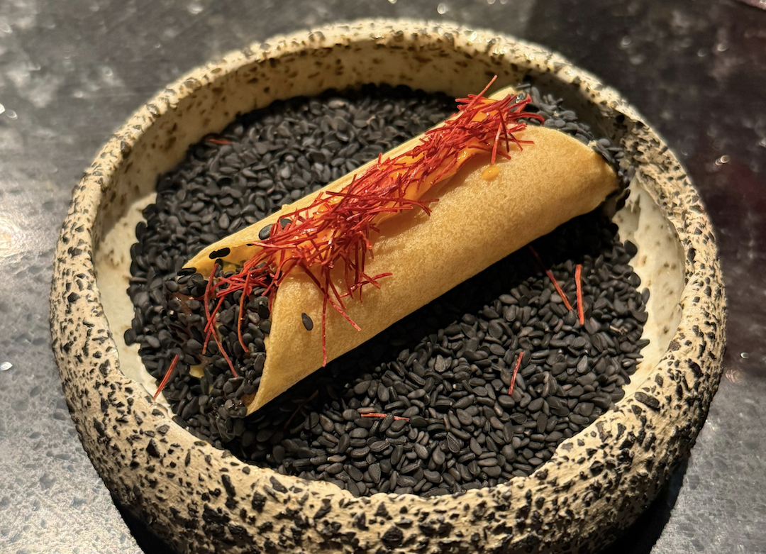 The eight-course tasting menu is a journey not designed to fill you up but rather open your palate and mind to what fusion food really can be. Here, the creative process begins with some sort of memory, flavor profile or a single ingredient, its then built outward. That’s why something as simple as the first dish, the Spring Roll, deceptively set the tone for the meal. Each bite lingers, finishing with a bit of heat, while visible saffron threads rest on top of a bed of sesame seeds, signaling early on that this is a menu designed to unfold thoughtfully rather than overwhelm.