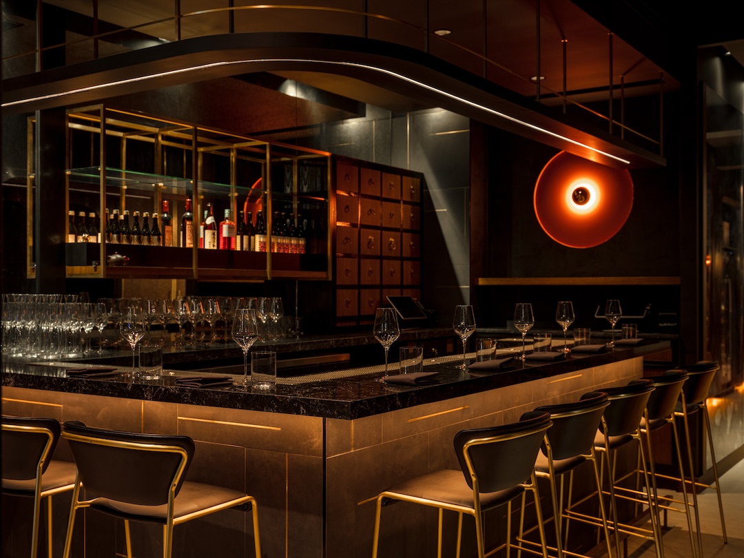Inside Yingtao, the mood is sultry. Set in a trendy Hell’s Kitchen space, the interior is complete with black marble countertops, brass chairs, and deliberate splashes of scarlet that nod to the restaurant’s cherry motif. A curated ’90s hip-hop playlist blasts through the room, reinforcing its young energy with the likes of Biggie and Drake. We were seated at the counter, front row to the action: the galley kitchen is completely open to the dining room, transforming a meticulous service into a quiet performance as five chefs move with focused precision.