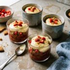 Creamy Italian zabaglione custard lightened with whipped cream and balanced with tart rhubarb compote, chopped strawberries, and hefty dusting of spicy ginger cookie crumble. Trust us, it doesn’t get better than this.