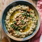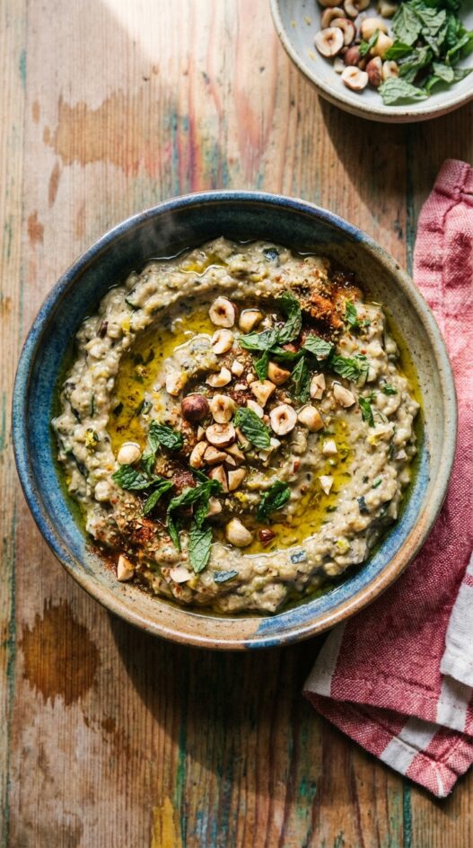 - Transfer to a shallow bowl and garnish with mint, spices, chopped nuts, and olive oil.