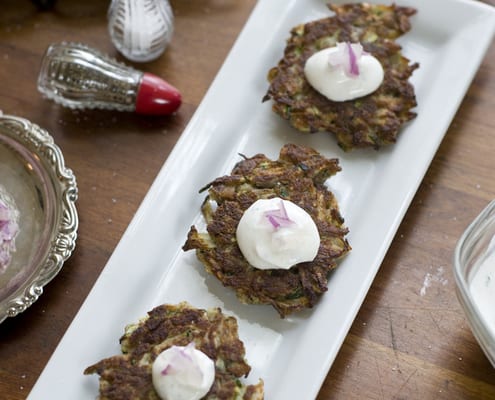These zucchini pancakes, reminiscent of potato latkes, are a savory appetizer made with shredded zucchini and buckwheat, perfect with a dollop of horseradish sour cream.