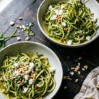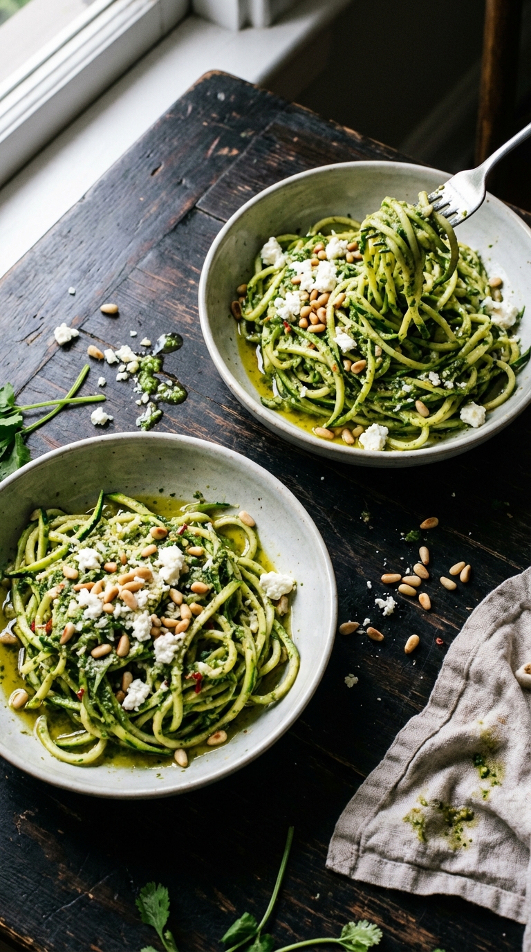 Fresh zucchini noodles tossed in a vibrant coriander and cashew pesto. Topped with toasted pine nuts and feta for a light and flavorful meal.