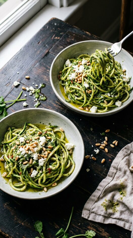 I started making zucchini noodles a few summers ago when the garden produced more zucchini than anyone could responsibly eat as a vegetable side dish. This coriander and cashew pesto version became the one I kept coming back to. Coriander pesto sounds a little unusual if you grew up on basil, but the flavor is bright and slightly grassy in a way that pairs well with the mild zucchini. Cashews give it a creaminess that pine nuts can’t quite match. Goat’s feta crumbled on top adds enough salt and tang to pull everything into focus.
