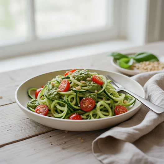 This Zucchini Spaghetti with Pesto and Cherry Tomatoes is a refreshing, no-cook dish perfect for summer, combining the delicate flavor of zucchini with the fragrant taste of pesto and the vibrant touch of cherry tomatoes.